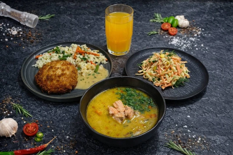 Бизнес-ланч 1. Салат "Крабовый" - 90 гр. 2. Суп из лосося - 250 гр. 3. Котлеты из белой рыбы с рисом и сливочным соусом - 200 гр. 4. Хлеб 50 гр.